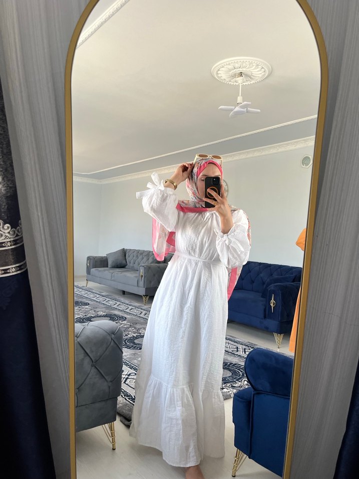 Yüksek yakalı, dökümlü beyaz pamuklu uzun elbise. Salaş kesim ve ince bağcıklı askılarla, hafif batik desenlidir. Günlük kullanıma uygun, mütevazı tarz.