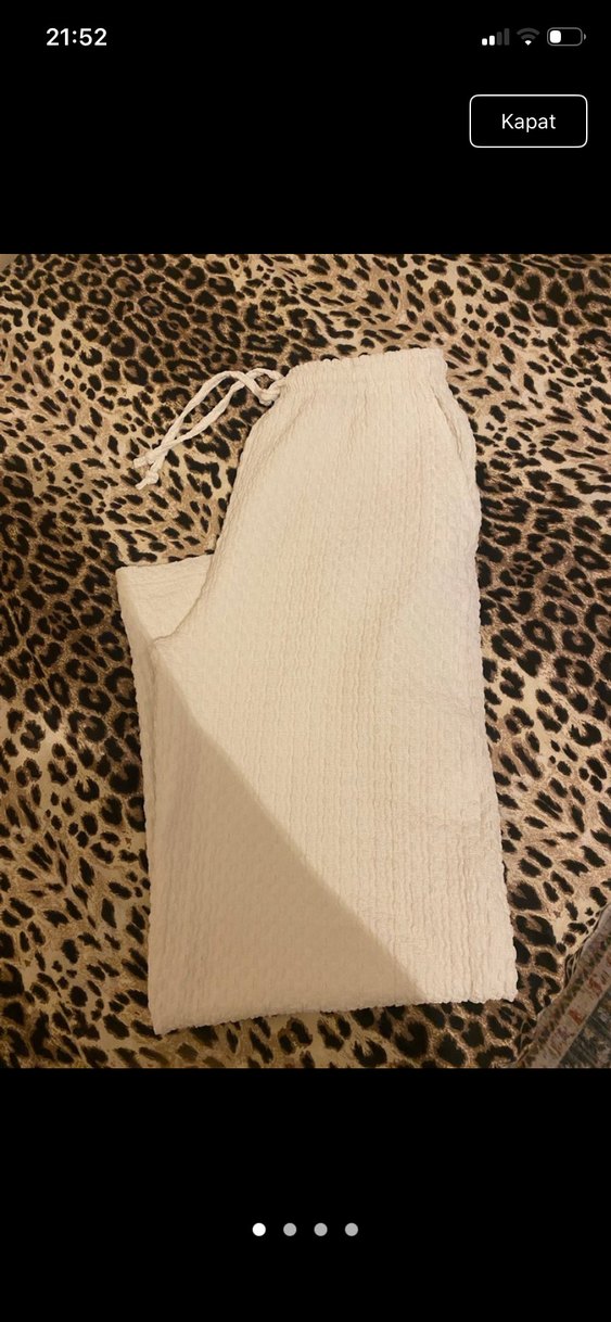 Yumuşak sentetik kumaştan, kürk detaylı beyaz bohem stilde, rahat kesim midi uzunlukta kadın kumaş pantolon.