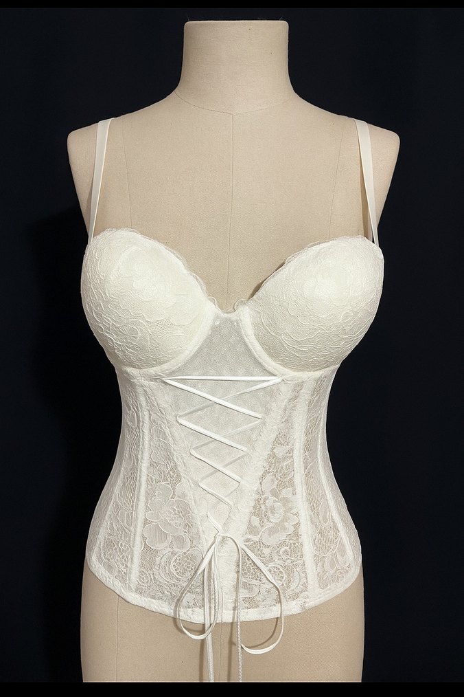 75/B Dantel detaylı, ayarlanabilir askılı beyaz bohem tarzda Parisian midi büstiyer. Korsaj bağcık ön tasarımına sahip, hafif ve zarif.