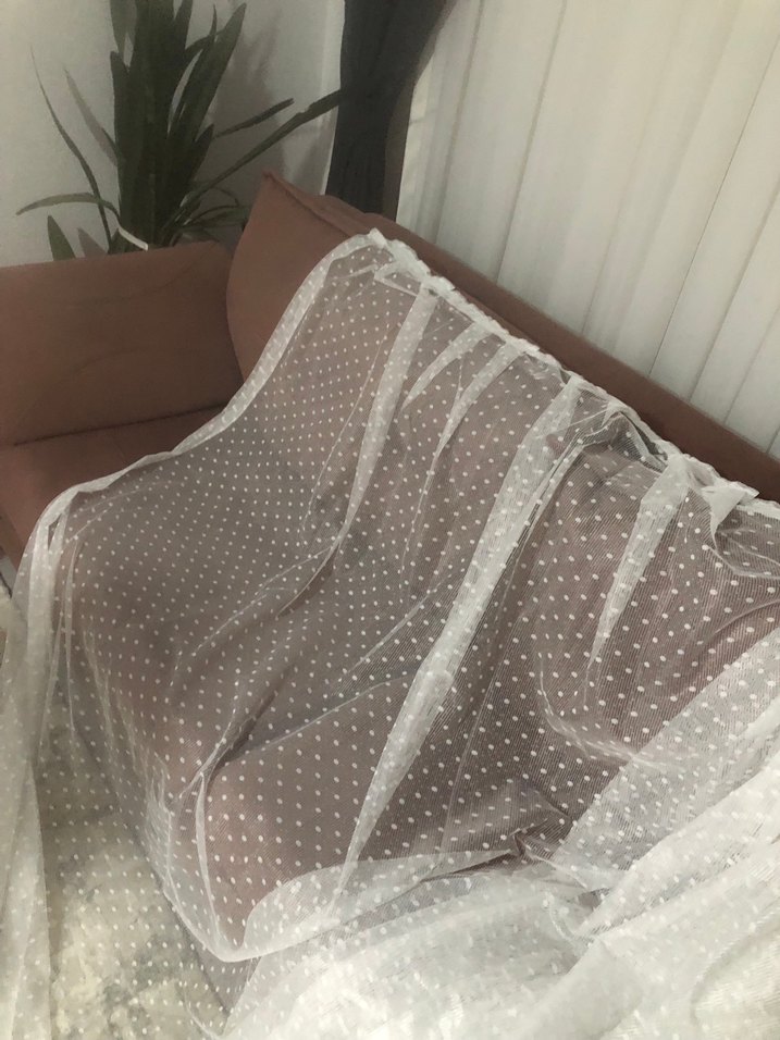 Bohem tarzda, hafif ve şeffaf beyaz puantiyeli tül perde, mekâna ferah bir hava katar.