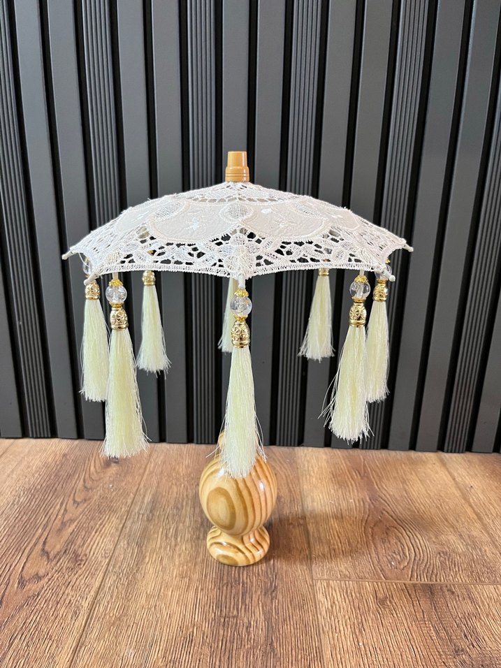 Beyaz renkte, püsküllü bohem tarzı kadın şemsiyesi. Retro ve hippie stillerine uygun hafif tasarım. ☂️ krem rengi