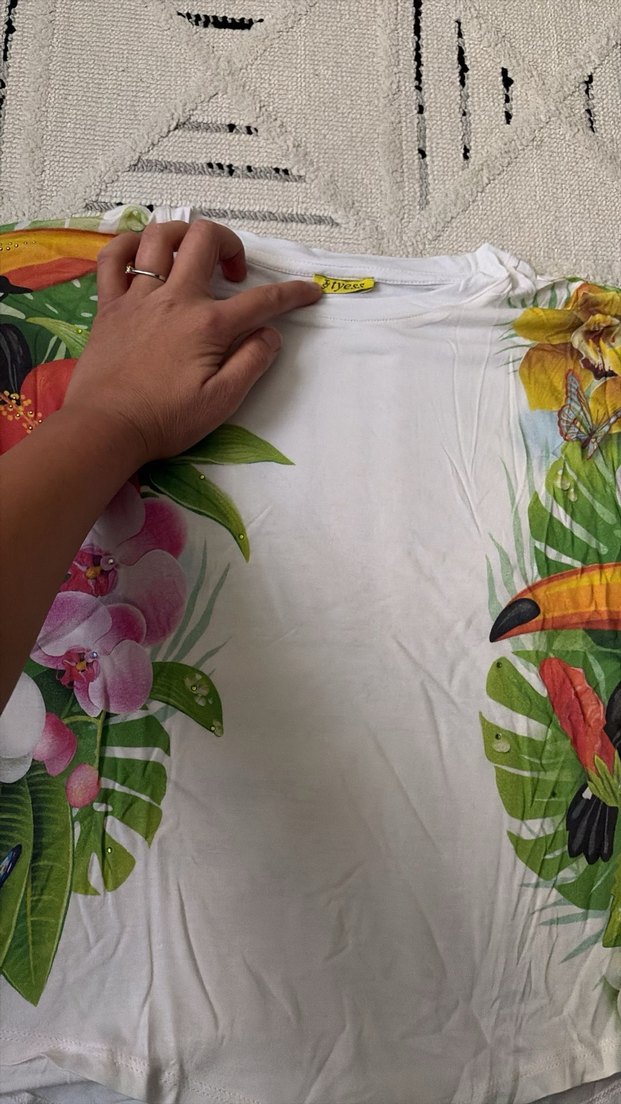 Beyaz renkte, renkli baskılı, yuvarlak yaka ve kısa kollu tişörtü. Bol kesimi ve midi boyu ile günlük kullanıma uygun bohem tarzda.