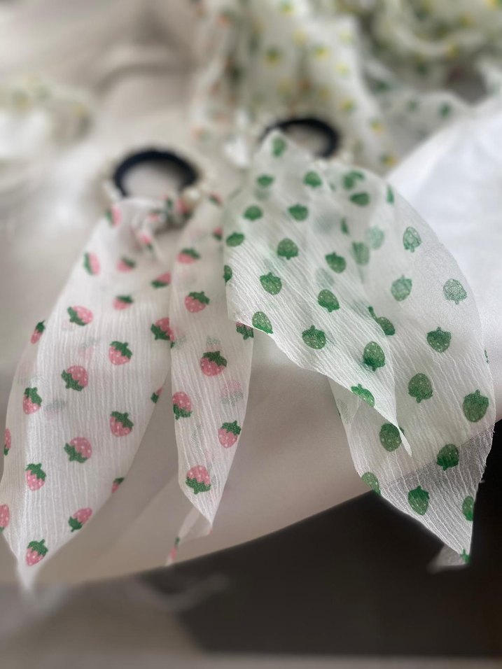 Beyaz sentetik kumaştan yapılmış, pastel çilek ve brokoli desenli, kurdele detaylı bohem tarz saç tokaları. Retro ve hippie görünüm için uygundur.