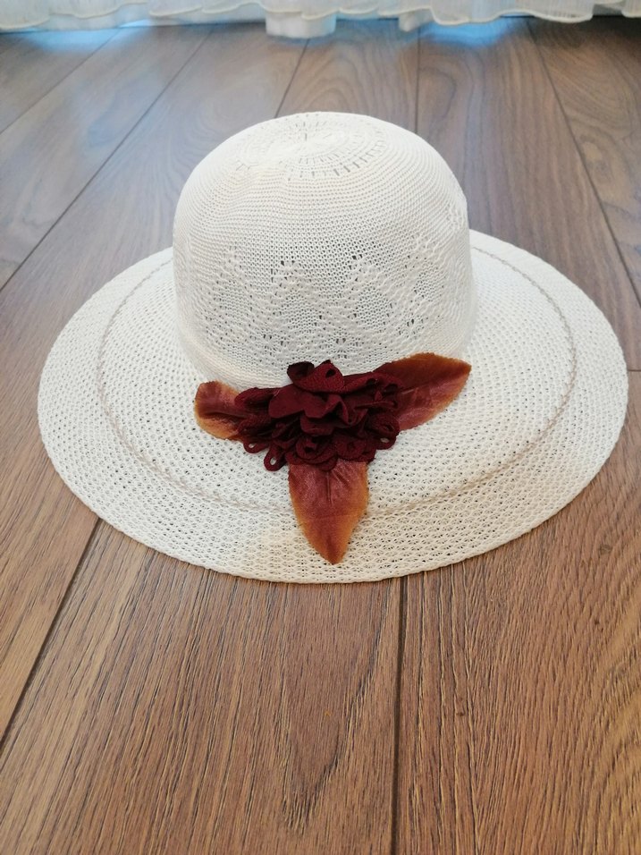 Beyaz örme kumaştan yapılmış, üzerinde koyu renk çiçek ve fırfır detayları bulunan bohem tarzda kadın şapkasıdır. Hafif ve şık bir aksesuardır.Hiç kullanılmadı