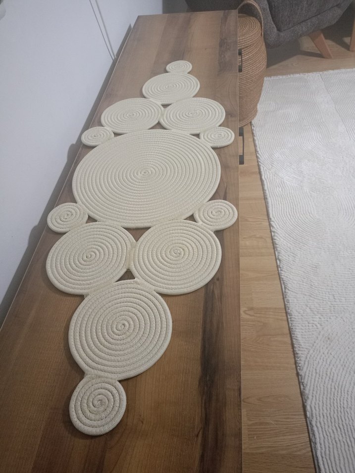 Bohem tarzda beyaz runner, spiral desenlerle sade ve yumuşak dokulu, mekâna sanatsal bir dokunuş katar. 35*95 cm istenilen renkte yapılır
