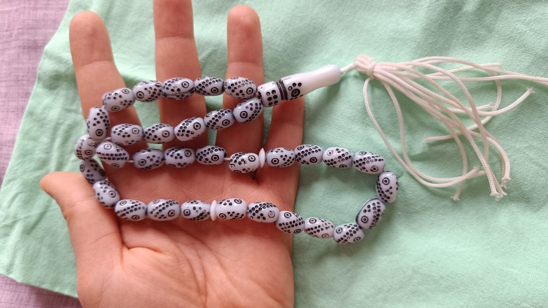 Beyaz boncuklar üzerinde siyah desenler bulunan, beyaz ip ile bağlanmış bohem tarz erkek tesbih. ️