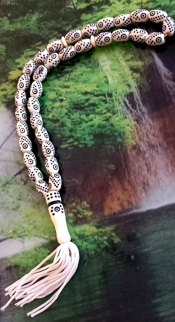 Bu erkek tesbih, beyaz boncuklardan oluşan geleneksel tasarıma ve renkli bohem stiline sahiptir. Ucunda püskül bulunur.