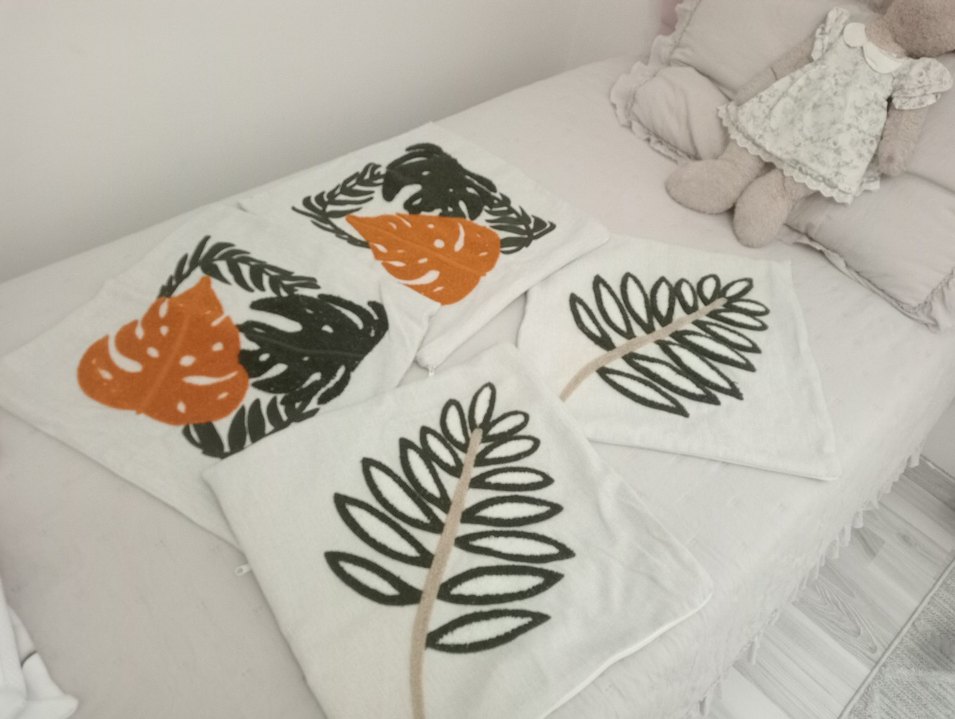 Hafif renklerde, yaprak baskılı bohem tarzı beyaz yastık kılıfları. Doğadan esinlenen tasarım, mekâna sıcaklık katıyor.
