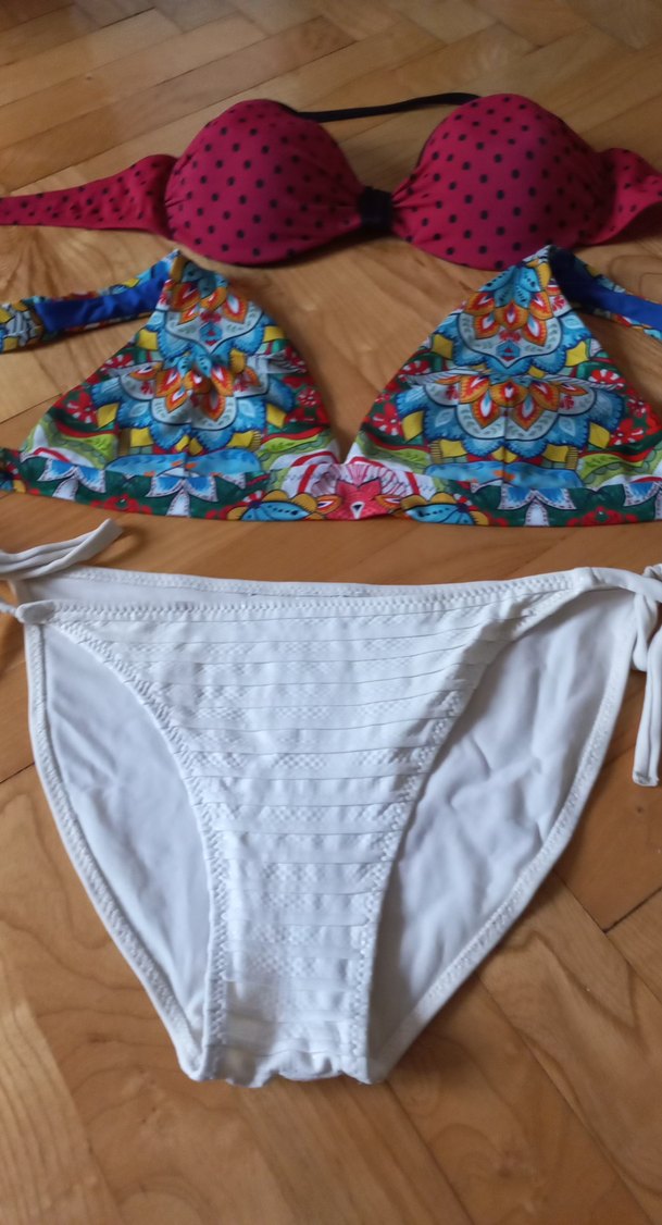 Beyaz bikini elastik yapıya sahip, normal boyda ve yan bağlamalıdır. İnce dokulu deseniyle bohem plaj stiline uygundur.