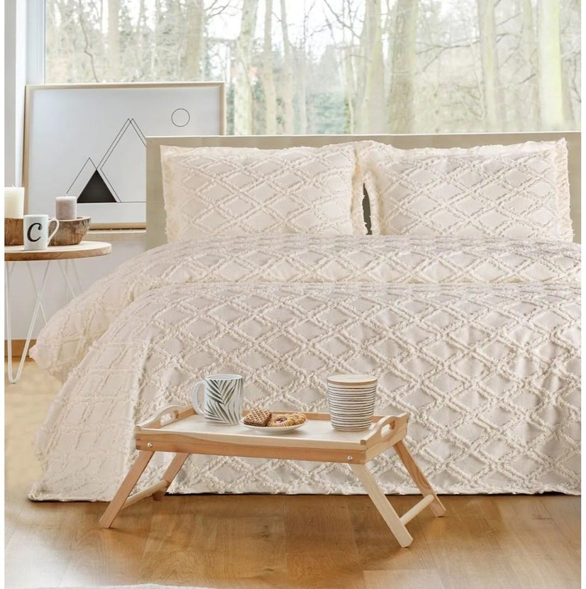 Beyaz ve açık tonlarda, bohem tarzda desensiz kahvaltı tepsisi. İçecek ve atıştırmalıklar için kullanışlıdır. ️ Cift kisilik 3 parça yatak örtüsü 240×260cm Battal boy