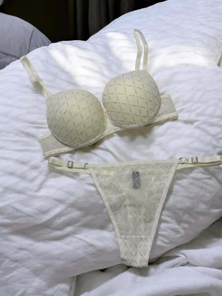 Beyaz sütyen ve külot takımı, hafif kare desenli ve ayarlanabilir askılıdır. Bohem tarzıyla zarif ve rahat bir görünüm sunar.