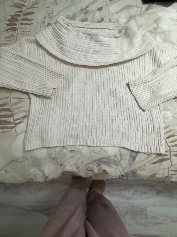 Beyaz renkli, triko kumaştan yapılmış bu kazak, kayık yaka ve uzun kolludur. Salaş, kısa kesimiyle bohem ve rahat bir stil sunar.