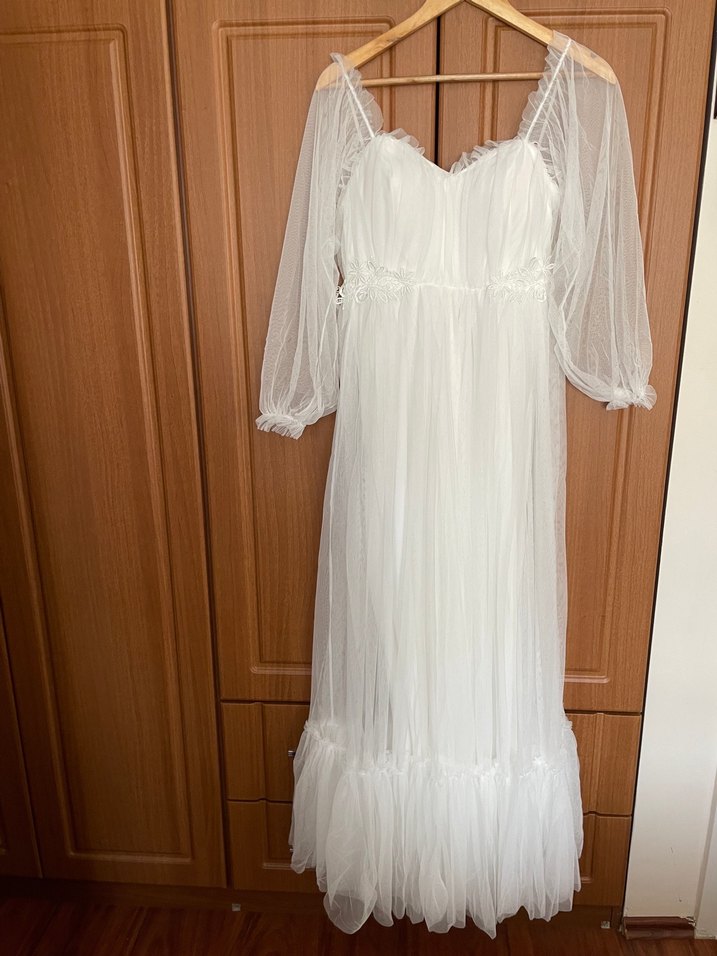 Beyaz bohem elbise straplez yaka, ince askılı bol uzun kollara ve uzun A kesim siluete sahiptir. Hafif ve rahat bir yapıya sahiptir.