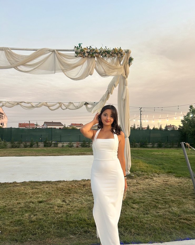 Askılı kollu, straplez yakalı beyaz uzun bir kere giydim