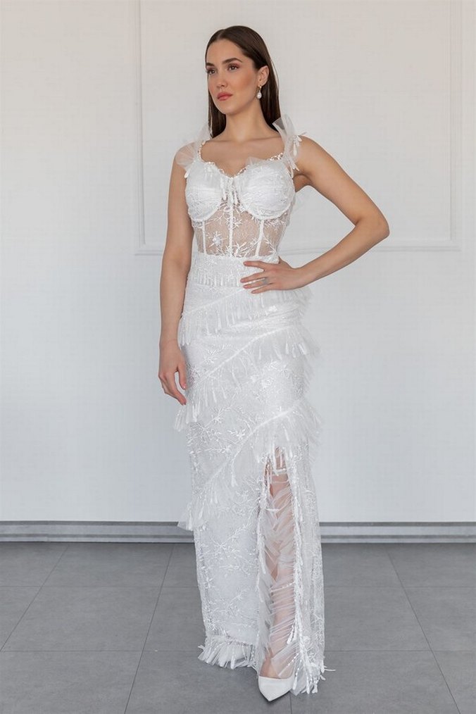 Beyaz bohem tarzda, askılı ve straplez detaylı, düz kesim dantel ve püsküllü uzun gelinlik. Şık ve trend bir düğün kombini için uygundur. elbise hiç giyilmedi etiket üzerindedir bedeni uymadı iade ile ulaşamadıgım için kaldı