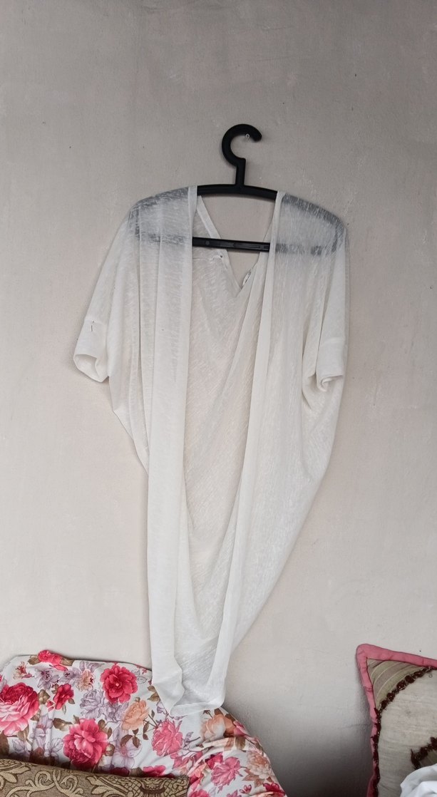 Beyaz, uzun boy kadın elbisesi, bol kesim ve kısa kollu, minimal bohem tarzında. Desensiz ve açık renkte, rahat bir siluet sunar.