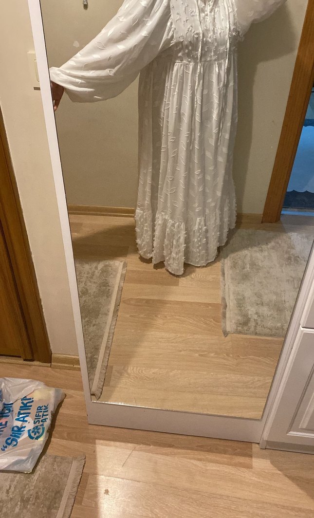 Beyaz uzun keten elbise, bol kesim, uzun kollu ve straplez yakalıdır. Yırtmaçlı ve bohem tarzda, rahat ev kullanımı için uygundur. Hiçbir hasarı yok 1700 TL’ye alındı sadece birlere bebek Mevlüt’ünde giyildi