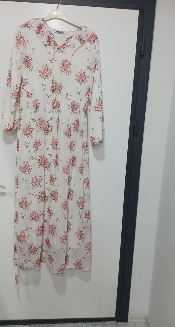 Beyaz, uzun kollu, V yaka ve pile detaylı bol kesim elbise. Pastel çiçek desenli, bohem tarzı için uygun. 42 44 bedenede olur
