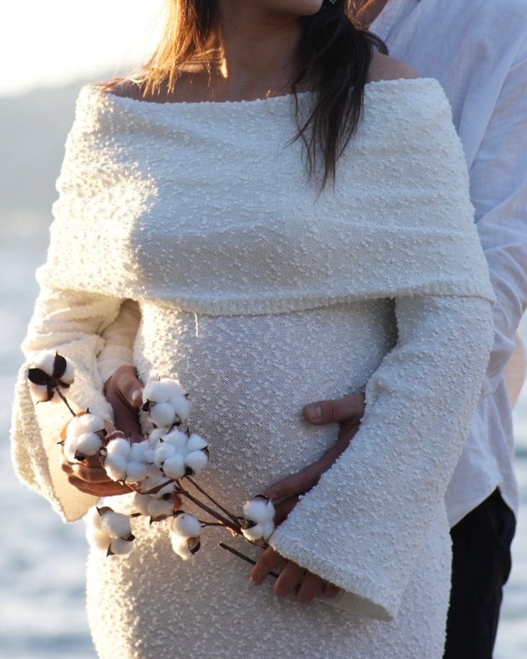 Yumuşak pamuktan örme dokulu beyaz, bohem tarzda, uzun kollu ve uzun boy hamile triko kazak. Rahat ve şık, düğün için uygun.