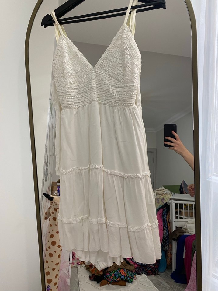Uzun beyaz bohem elbise, V yakalı, ince askılı ve bol kesimdir. Dantel detaylı üst kısmı ve kat kat etekleri romantik akşamlar için uygundur.