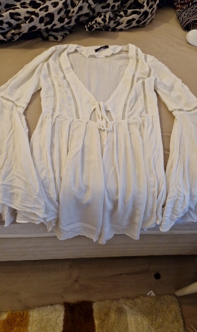 Yumuşak keten kumaştan, bol kesim beyaz midi tunik. Uzun kollu, drapeli ve V yakalı, bohem tarzını yansıtıyor.