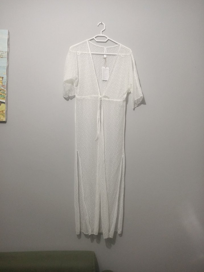 Beyaz renkli, uzun boylu kadın elbisesi, bol kesim ve kısa kolludur. Minimalist bohem tarzda, hafif ve rahat bir dokusu vardır.