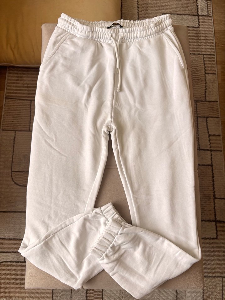 Yumuşak keten kumaştan beyaz, bol kesim kadın eşofman altı. Lastikli ve bağcıklı bel, desen içermeyen midi boy, günlük rahatlık ve şıklık sunar. ️