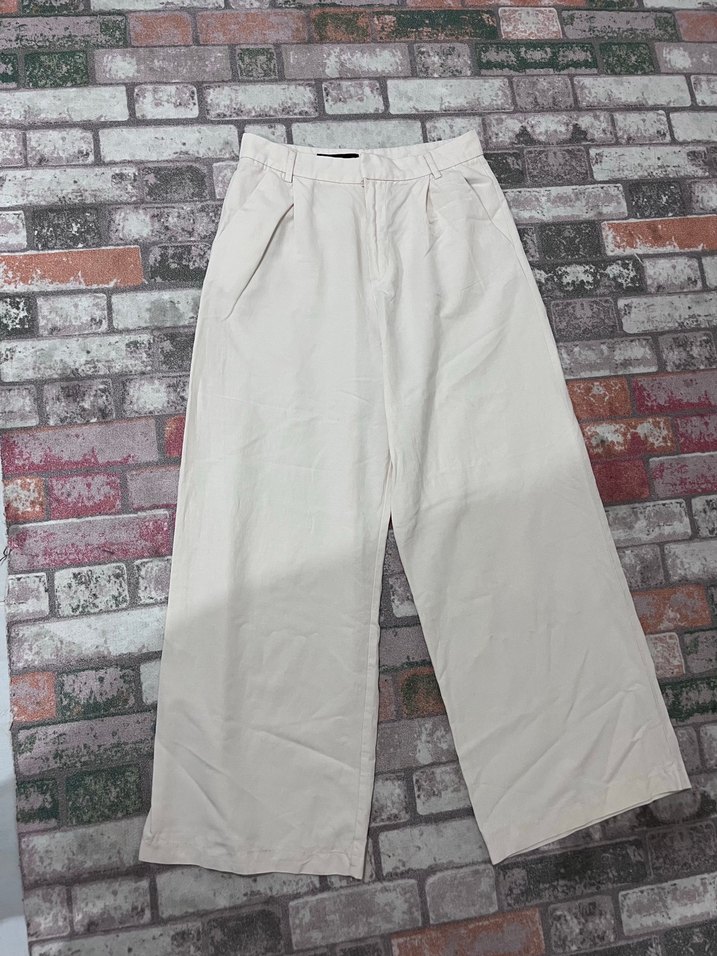 Beyaz keten kumaştan, bol kesim ve normal boyda, günlük rahat kullanım için zahmetsiz şıklık sunan pantolon.