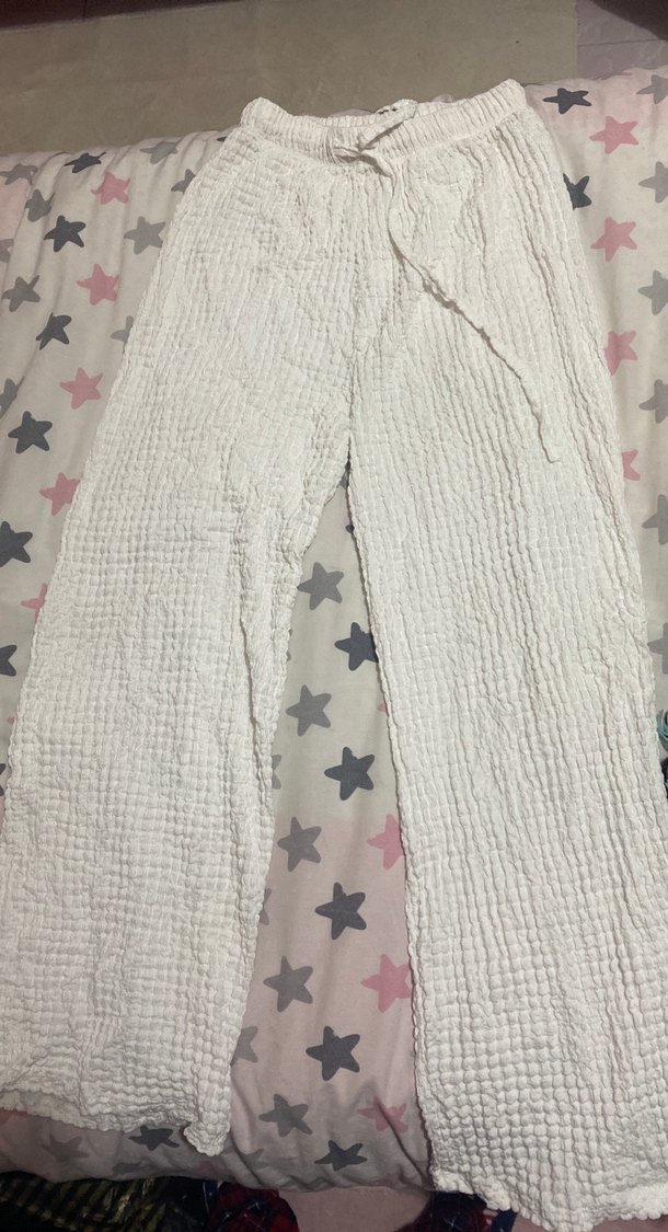 Bol kesim, beyaz keten pantolon, pileli dokusuyla bohem tarzda, günlük kullanım için uygundur.