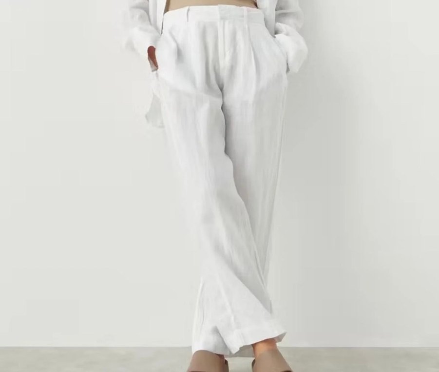 Beyaz keten kumaştan, normal boy midi kadın pantolon. Minimalist ve desen içermeyen tasarımıyla rahat ve şık bir görünüm sunar. minik lekeleri var onun dışında defosu yok