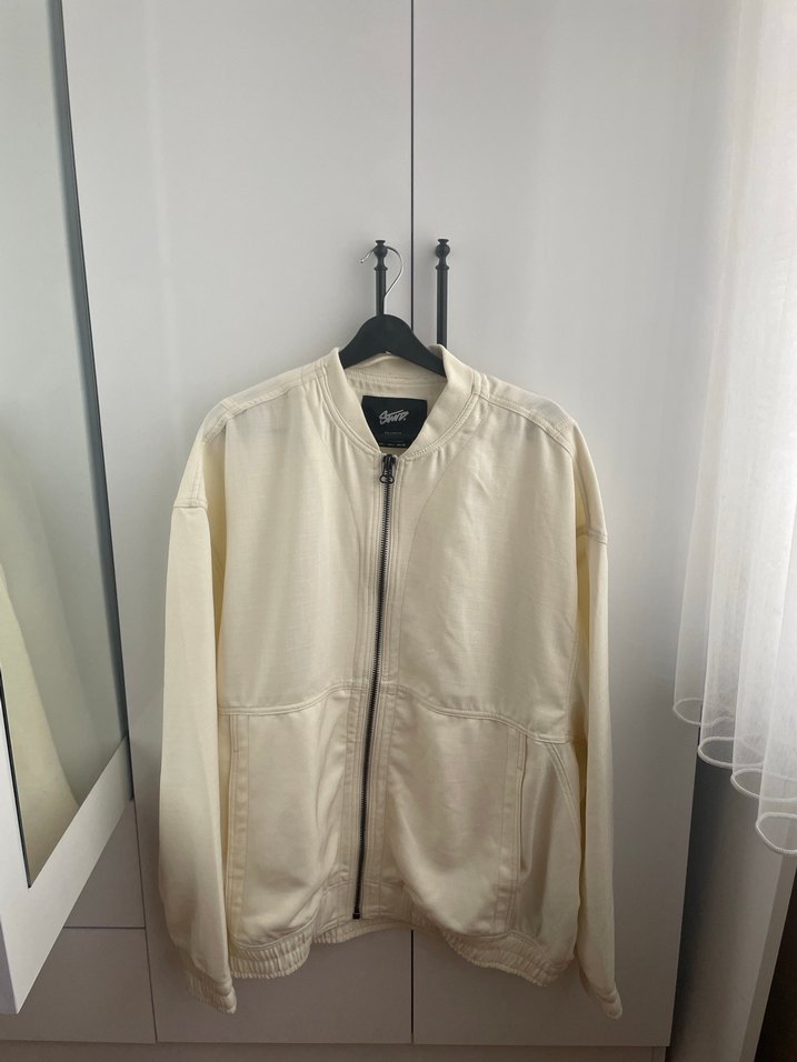 Yüksek yakalı, fermuarlı ve cep detaylı, keten kumaştan yapılmış beyaz ve bol kesim ceket. Minimalist tarzda, günlük kullanıma uygun. L beden ama oversize