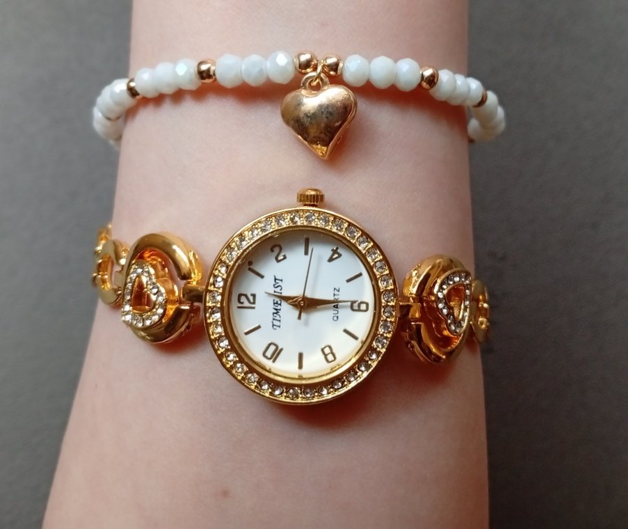 Altın renk kasaya sahip, taş detaylı kadın saati ve beyaz boncuklu bileklik üzerinde kalp figürü bulunur. Bohem ve gösterişli tarzı yansıtır. ⌚