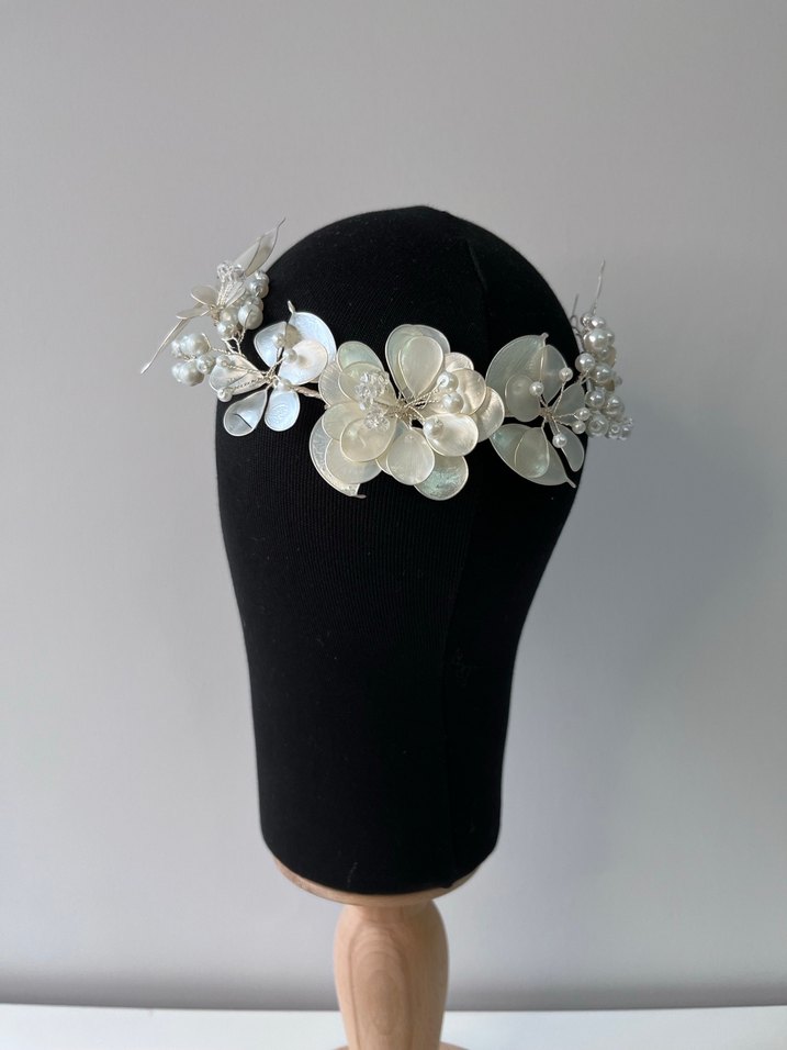 Bu çağdaş beyaz saç aksesuarı, boncuklarla süslenmiş avant-garde çiçek tasarımına sahiptir, modaya uygun trendsetterlar için idealdir.
