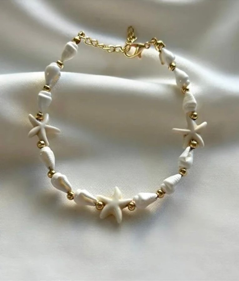 Yıldız şeklinde boncuklar ve küçük altın detaylar içeren beyaz boncuklu bohem bileklik. Ayarlanabilir zincir kapama ile rahat kullanım sağlar.