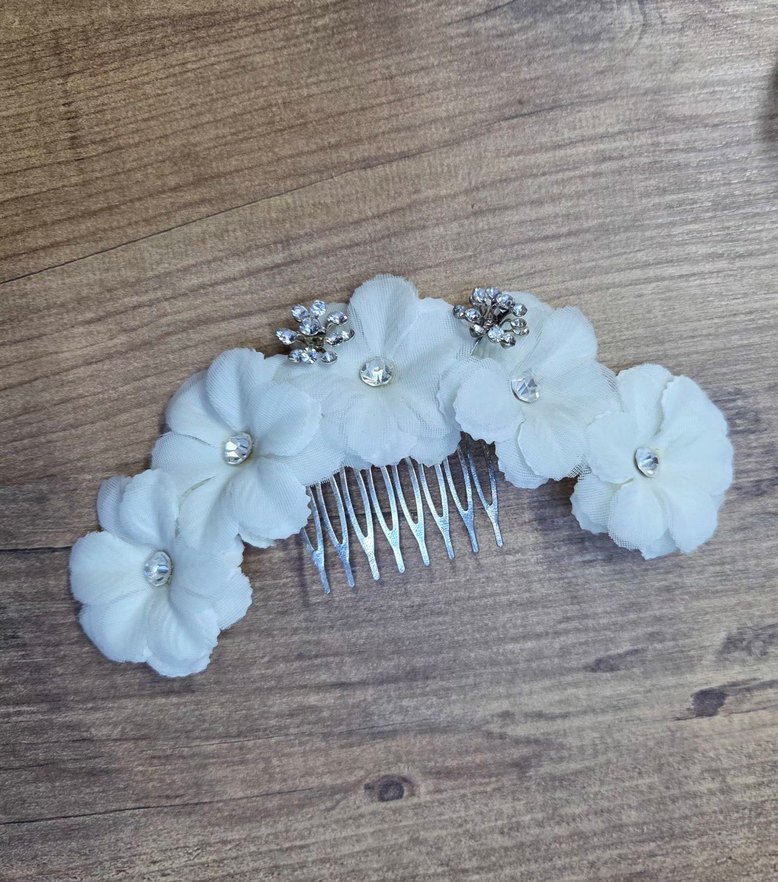 Beyaz sentetik kumaştan yapılmış, boncuklu ve taş detaylı bohem tarzda çiçekli saç tokası. Vintage ve retro esintili bir aksesuar.