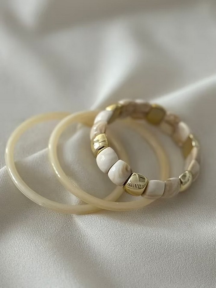 Beyaz boncuklu ve hafif altın detaylı, günlük kullanım için bohem tarzda kadın bileklik seti.