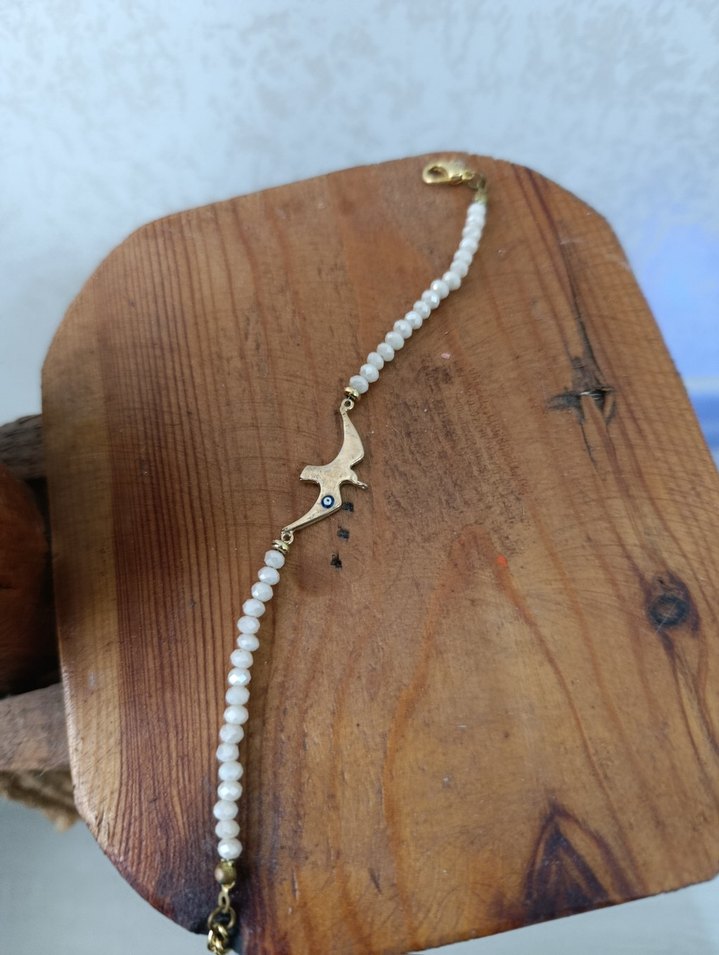 Beyaz boncuklardan oluşan, kanatlı kuş figürlü bohem tarzda kadın bileklik. Minimalist ve retro kombinlere uygun, günlük kullanım için ideal. ️