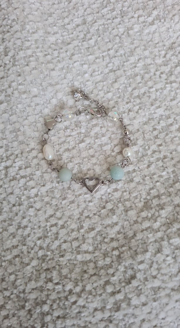 Bu kadın bilekliği, beyaz ve pastel boncuklar ile kalp şeklinde bir süs taşıyan bohem tarzda günlük kullanıma uygun bir aksesuardır.