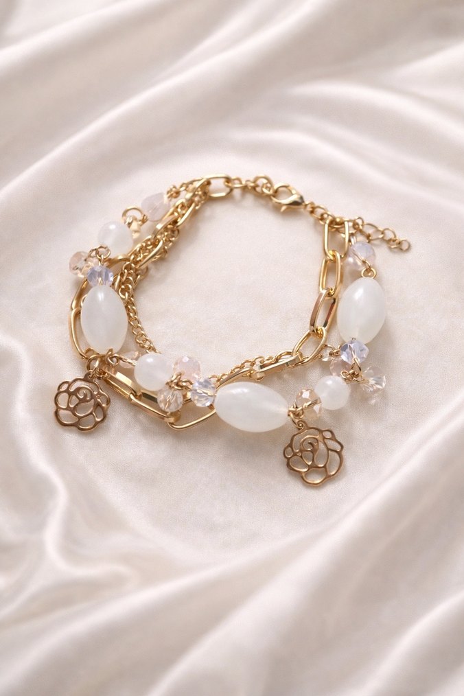 Bohem tarzda, beyaz boncuklar ve altın renk zincirlerde zarif çiçek figürlü kadın bileklik. Günlük kullanıma uygun.