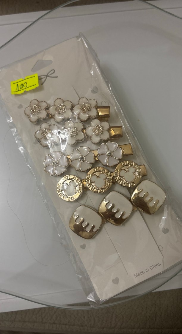 Beyaz, boncuklu, plastikten yapılmış çiçek ve geometrik desenli minimalist bohem kadın saç tokaları seti.