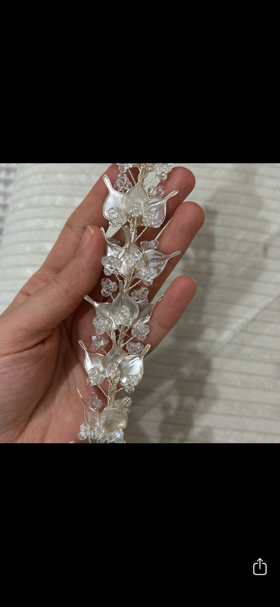 Cam boncuklardan yapılmış beyaz bohem saç aksesuarı, ışıltılı ve retro tarzıyla hippie görünümüne uygundur.
