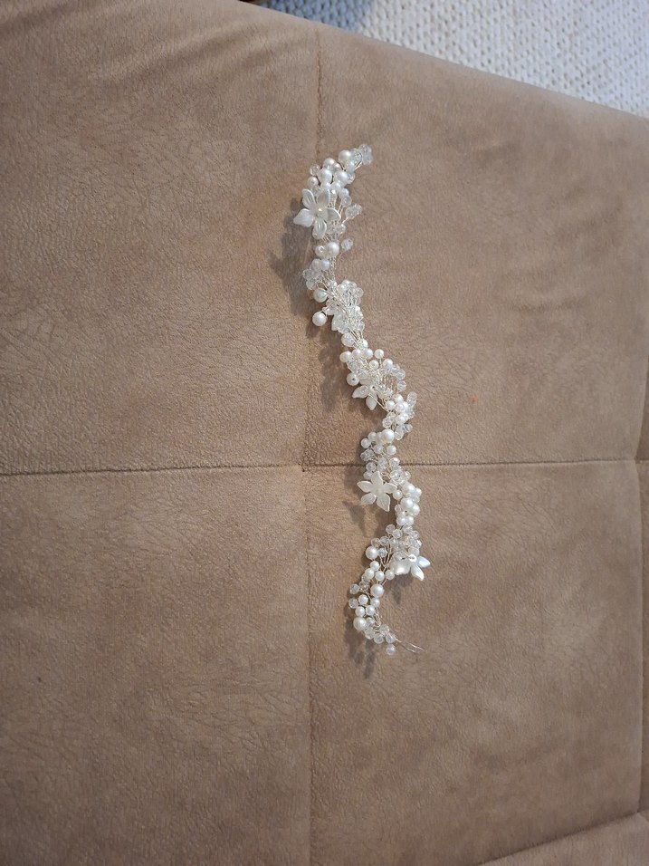 Beyaz boncuklarla süslenmiş, bohem tarzda sentetik taşlardan yapılmış minimal ve şık bir gelin saç aksesuarıdır. ✨