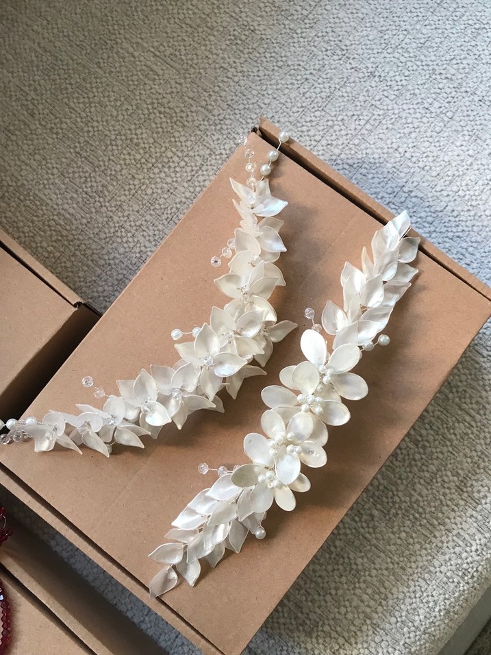 Plastikten yapılmış beyaz boncuklu, çiçek ve yaprak detaylı bohem tarzı saç aksesuarı, minimalist görünüm için uygundur.