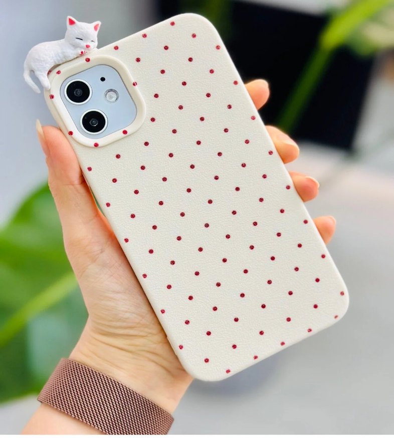 Pastel bohem tarzda, küçük kırmızı boncuklarla süslenmiş beyaz telefon kılıfı.