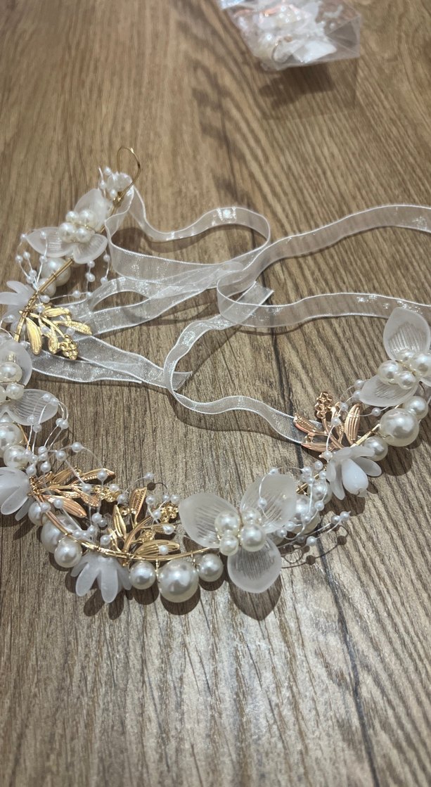 Beyaz boncuklar ve çiçek detaylarıyla cam malzemeden yapılmış, hafif ve bohem vintage tarzda saç aksesuarı.