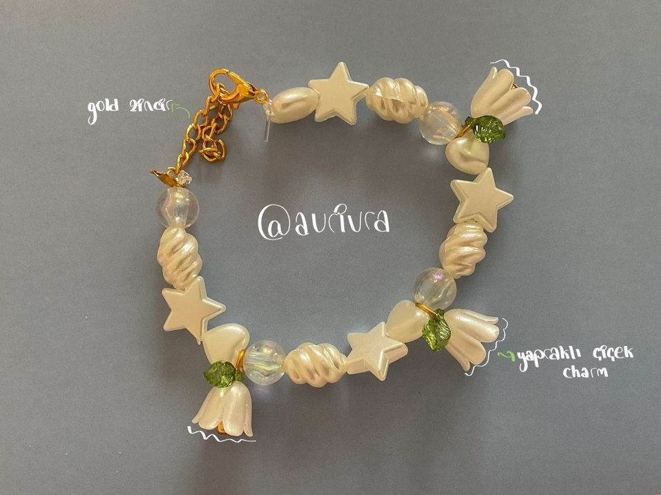 Altın renk ayarlanabilir toka ile beyaz boncuklu, yıldız ve çiçek şeklinde detaylara sahip bohem tarz bileklik. El yapımıdır