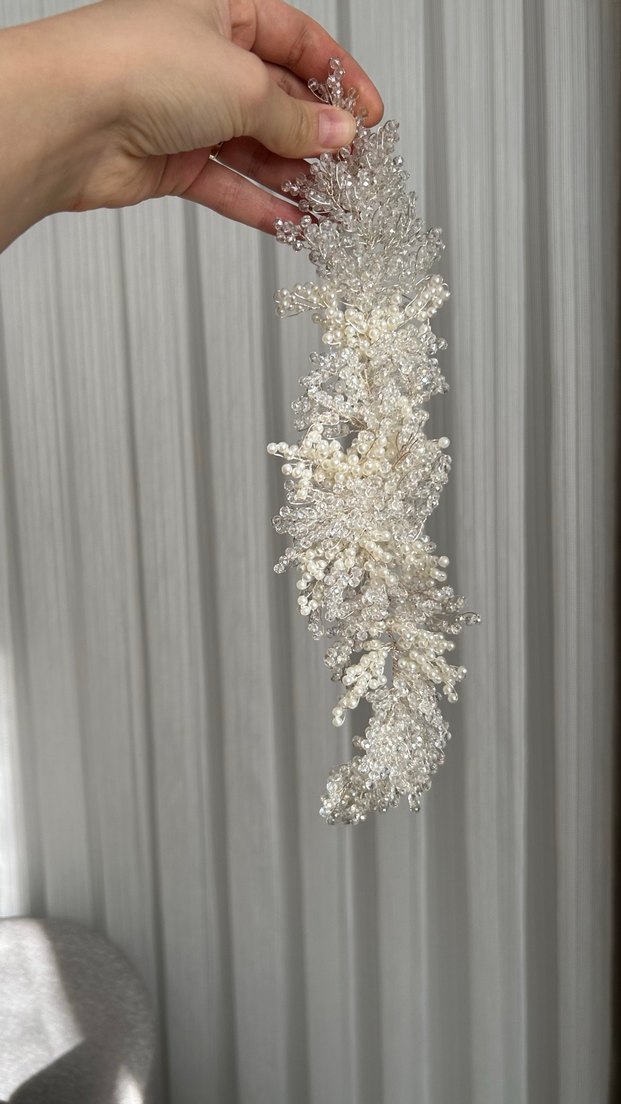 Beyaz cam boncuklarla süslenmiş, çağdaş ve avangart tarzda kadın saç aksesuarı. Trend belirleyenler için ideal. ✨ bir kez kullanıldı , temiz ve sağlamdır .