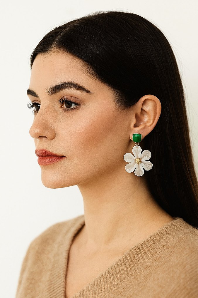 Beyaz boncuklu, çiçek desenli midi uzunlukta küpelerdir, trend günlük stil için uygundur.