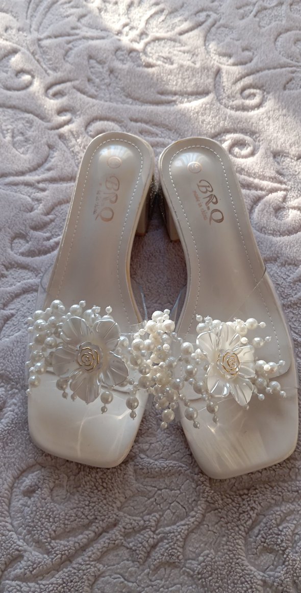 Yumuşak kauçuk malzemeden, beyaz boncuklu çiçek detaylı blok topuk terlik. Düğünler için klasik ve göz alıcı bir tarz sunar. Üzerinde BR.Q yazısı bulunur.