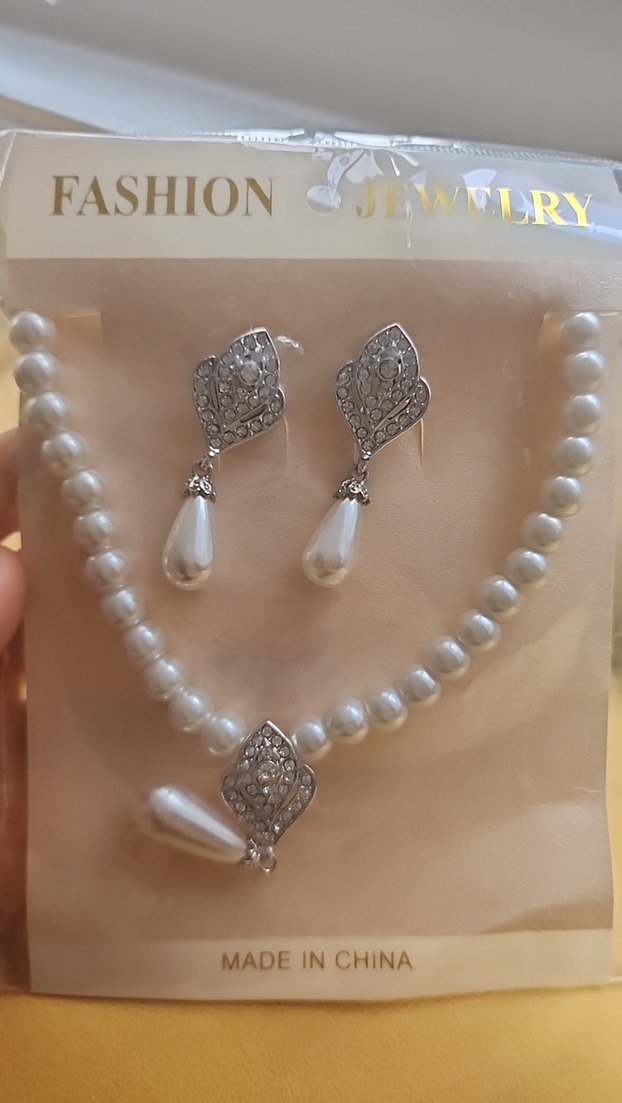 Kadınlar için beyaz boncuklu kolye ve nakış detaylı küpelerden oluşan gelin takı seti. Çin'de üretilmiştir.